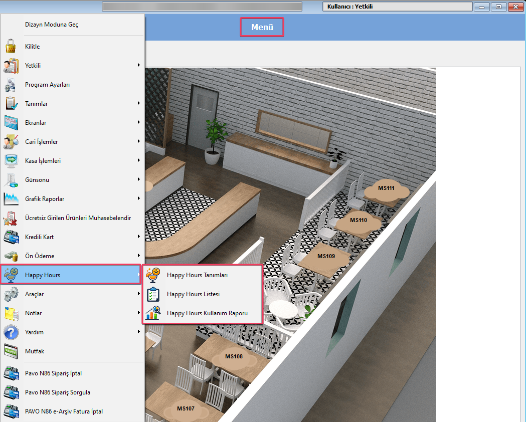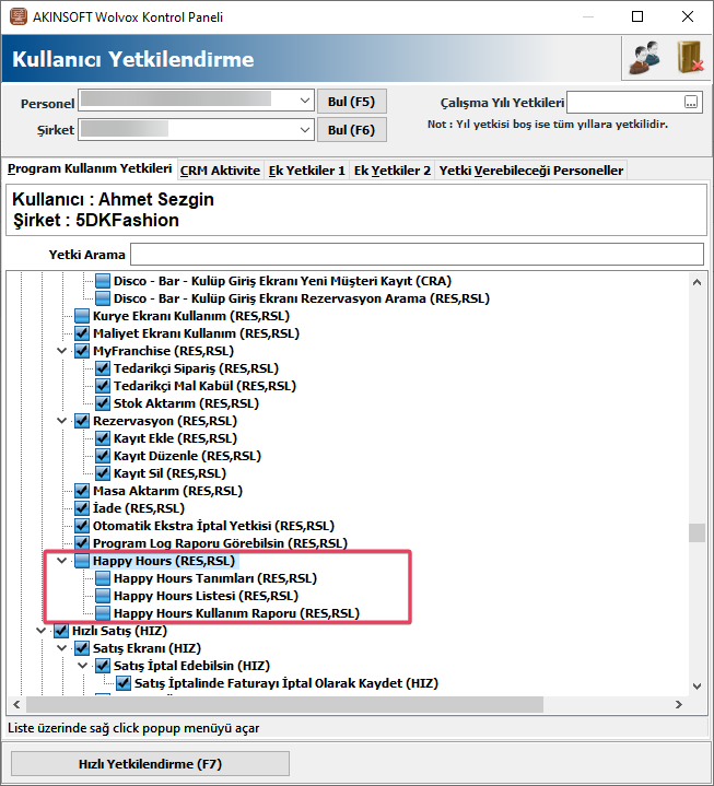 Kontrol Paneli üzerinde Happy Hours yetkileri bulunmaktadır. Kullanıcılarınıza istediğiniz yetkilendirmeyi buradan sağlayabilirsiniz.