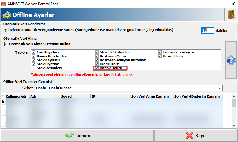 Eğer offline kullanım sağlıyorsanız ve verilerin otomatik gönderiminde kullanmak istiyorsanız, Kontrol Panel programı üzerinden Diğer İşlemler-Offline-Offline Ayarlar ekranından Happy Hours gönderimini işaretleyebilirsiniz.