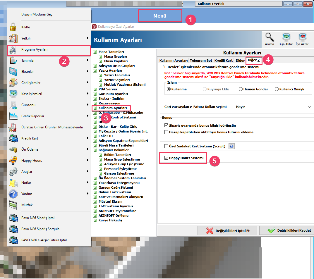 Happy Hours sisteminin kullanılabilmesi için öncelikle Restoran program ayarlarından aktif edilmesi gerekmektedir. Bunun için Restoran programından Menü - Program Ayarları - Kullanım Ayarları - Diğer 2 ekranından Happy Hours Sistemi ayarını aktif etmeniz gerekmektedir.