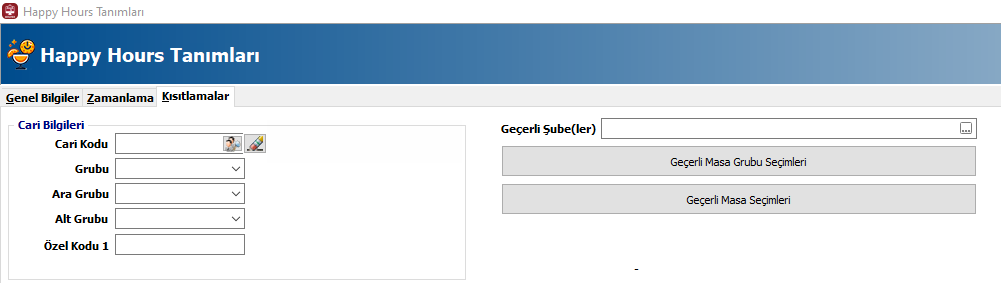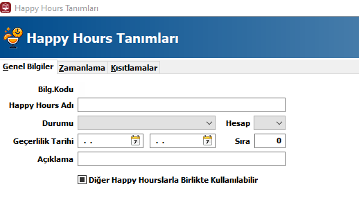 Happy Hours tanımı yapabilmek için Happy Hours Tanımları ekranını açın. Açılan ekranda üst bölümde genel tanımlama bilgileri, zaman ayarları ve kısıtlama ayarları bulunur.