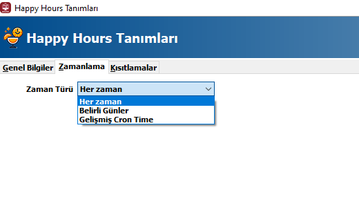 Belirli Günler → Happy Hours tanımının Genel Bilgiler sekmesinde belirtilen başlangıç ve bitiş tarihleri arasında seçtiğiniz günler ve saatler arasında çalışmasını sağlar.