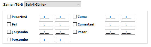 Bu sekmede Happy Hours tanımının Genel Bilgiler sekmesinde belirttiğiniz başlangıç ve bitiş tarihleri arasında hangi günler ve saatlerde çalışacağını belirleyebilirsiniz.