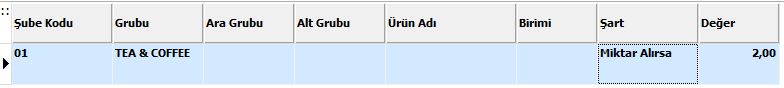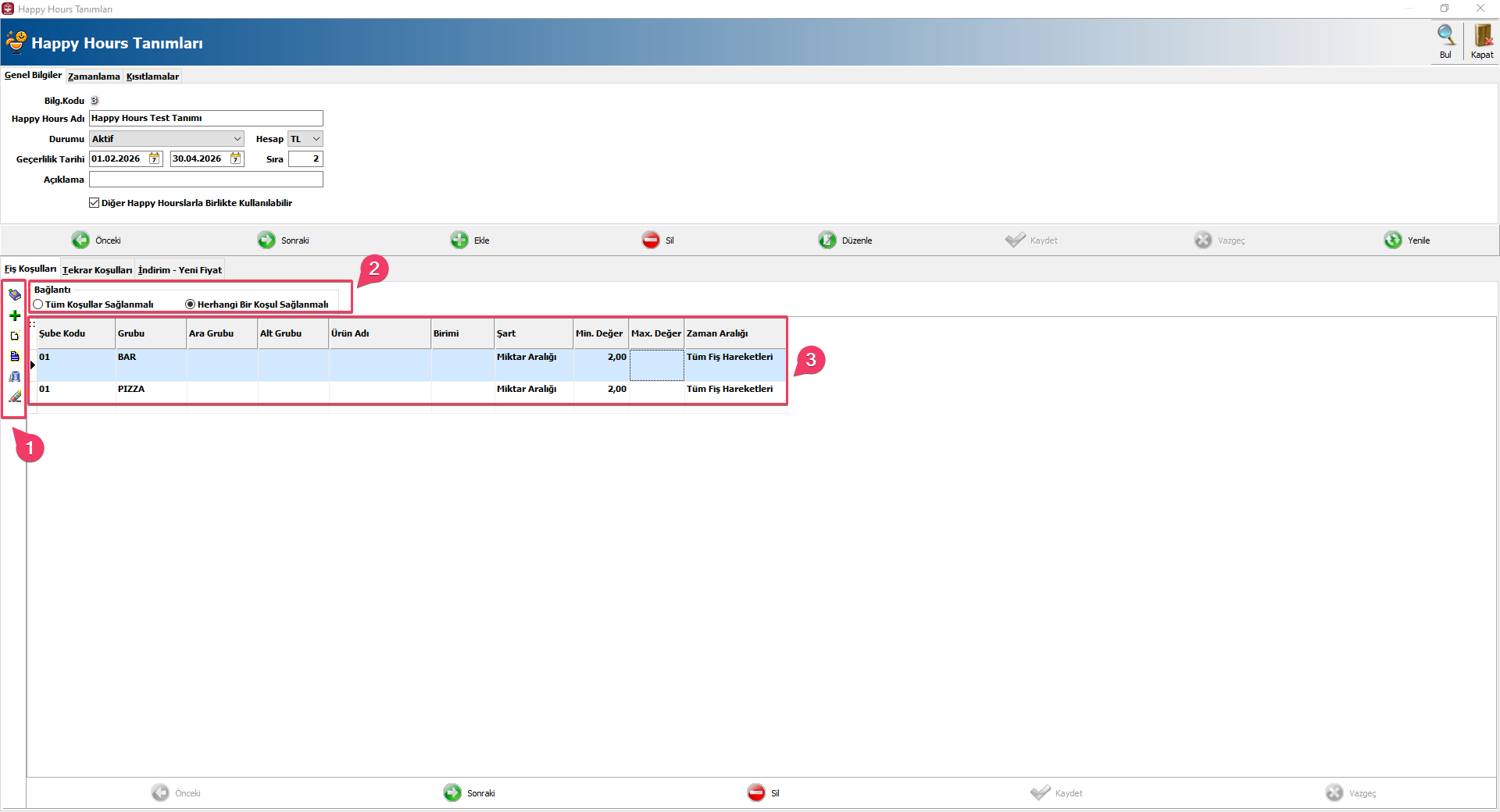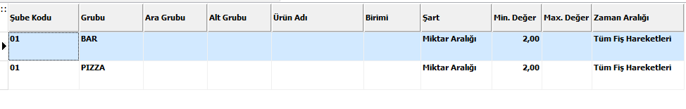 Bu sekmede Happy Hours tanımının sağlayacağı koşulu belirleyebilirsiniz. Örneğin, aşağıdaki görselde BAR ve PIZZA grubundaki ürünlerden minimum 2 adet sipariş edilmesi koşul olarak belirtiliyor.