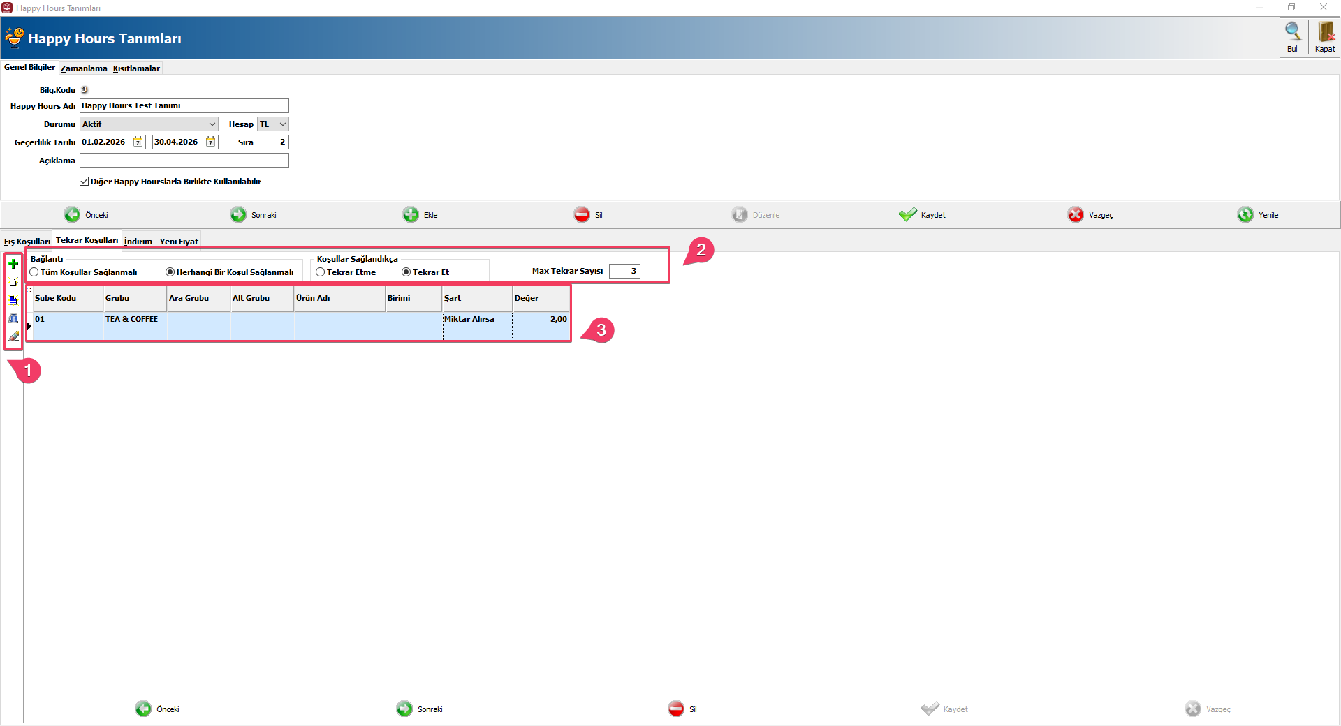 Happy Hours tanımının hangi şartlar altında kaç kere tekrar edileceği belirtildiği sekmedir. Herhangi bir veri girilmezse tanım koşul sağladıkça tekrar edecektir.