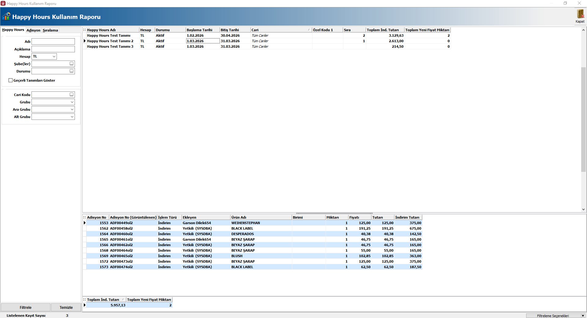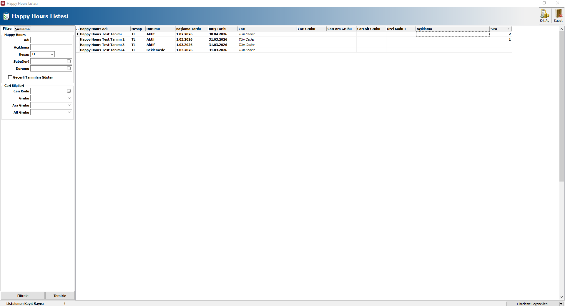 Bu ekrandan oluşturduğunuz Happy Hours tanımlarını görebilirsiniz.