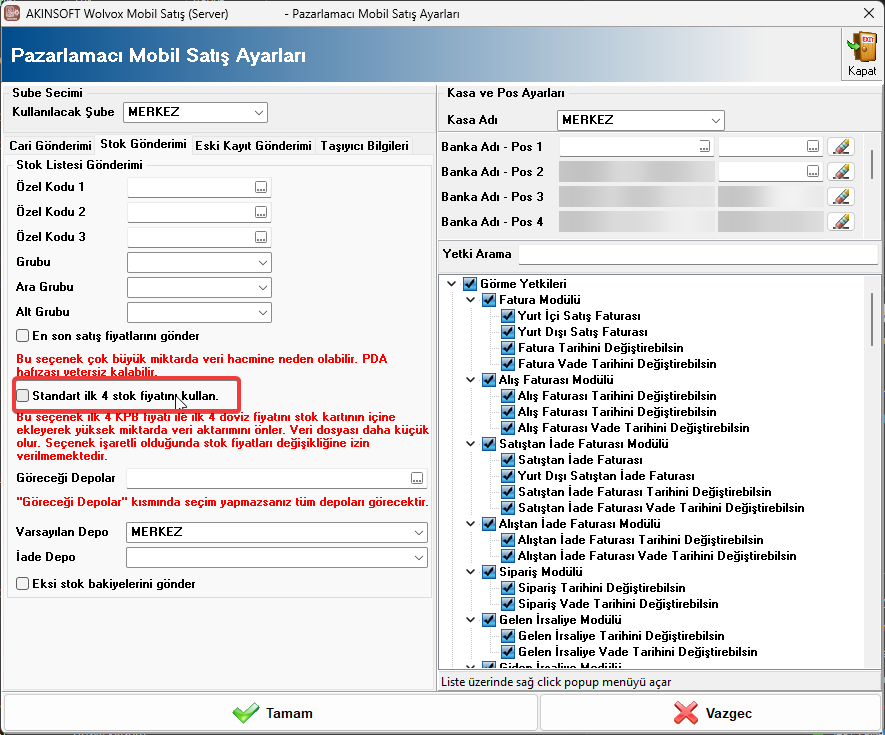Mobil server > Yetkili > Kasa, Pos ve Filtre tanımları > Stok gönderimi > Standart ilk 4 stok fiyatı kullan yetkisini kaldırmanız gerekmektedir.